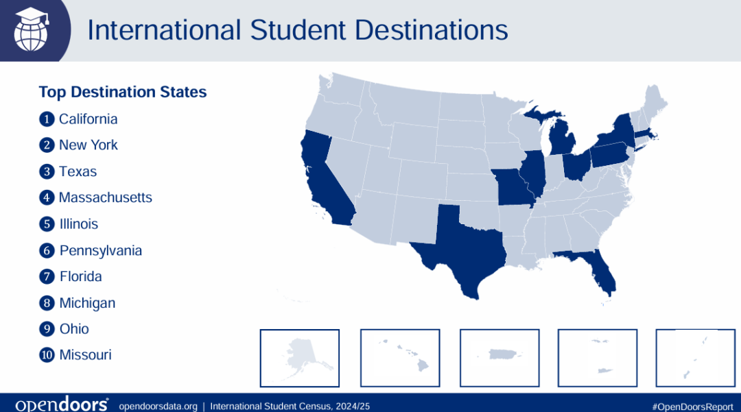 加利福尼亚州、纽约州和德克萨斯州的国际学生数最多。