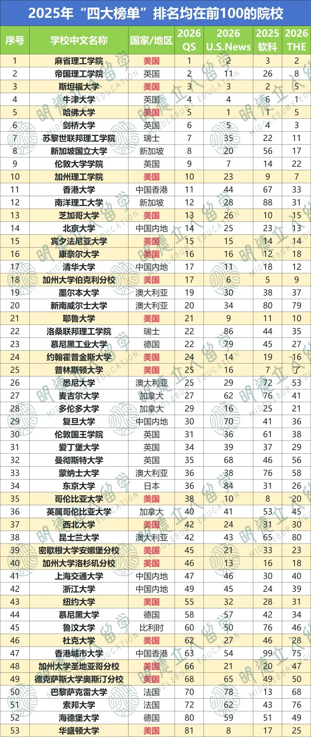 小德综合了最新版四大排名,以QS为基准,以下53所大学均在前100!而美国院校上榜20所,当之无愧的第一名!