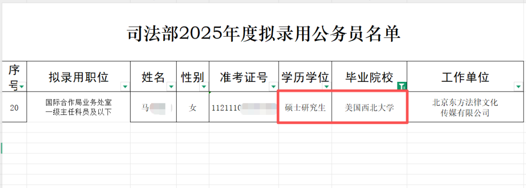 还有,司法部公布的2025年录用名单中,同样可以看到来自美国西北大学等海外院校的硕士毕业生。