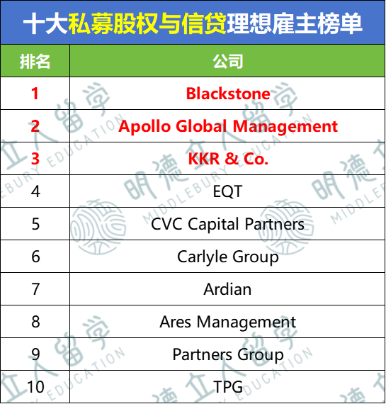Blackstone(黑石)在薪酬、工作趣味性与职业发展方面广受好评,连续三年蝉联榜首。Apollo、KKR、Carlyle 等跟随其后。