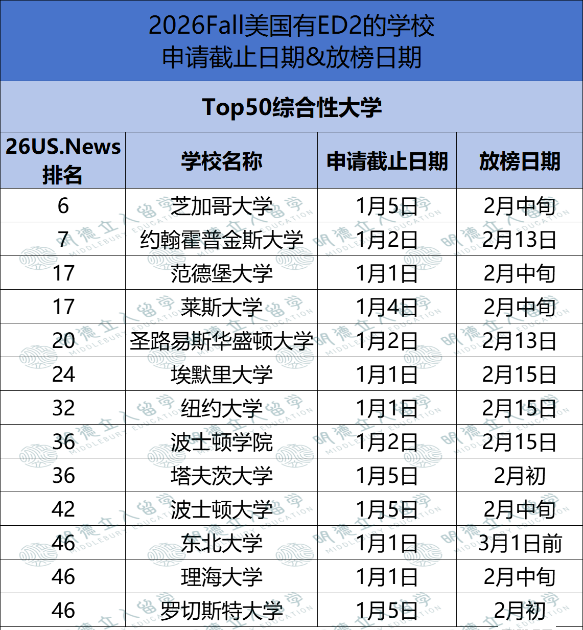 ❗️❗️2026Fall已明确有33所TOP级美本大学准备了「ED2大门」,分别是13所TOP50大U、20所TOP30文理。
