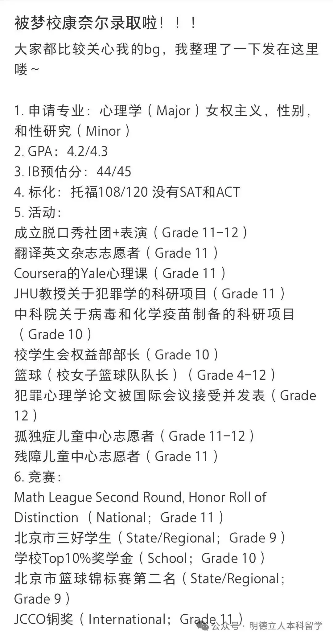 我们一起来看一个北京学生的案例,被康奈尔的心理学专业录取。