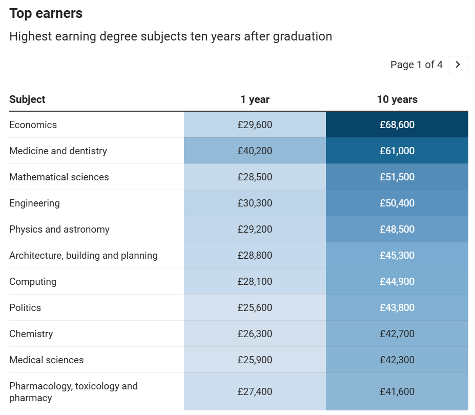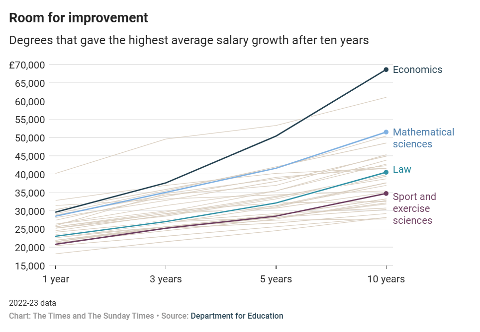 首先,泰晤士报先晒出《不同专业毕业1年vs毕业后10年后的薪资对比》,告诉我们哪些专业发展潜力高、增速高,作为选专业标准之一。