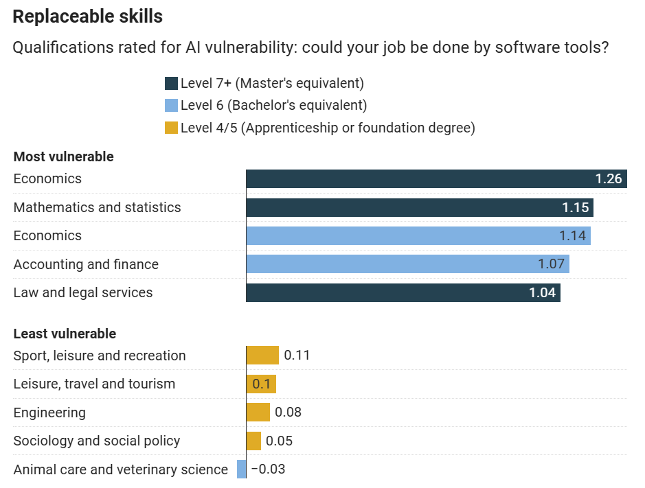 低风险抗AI的领域:工程学(0.08)、社会学(0.05)、兽医(-0.03)、体育与休闲(0.11);
