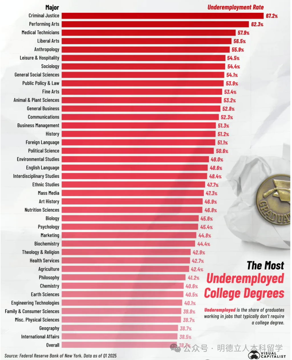 根据图表显示,美国大学专业的整体就业不足率已高达38.3%。