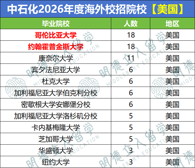 哥伦比亚大学、约翰霍普金斯大学、康奈尔大学的毕业生,最受到中石化的欢迎,尤其是藤校和Top10院校。以上大学均位列US.News全美综合排名前50,也反映出中石化对顶尖大学的喜爱。