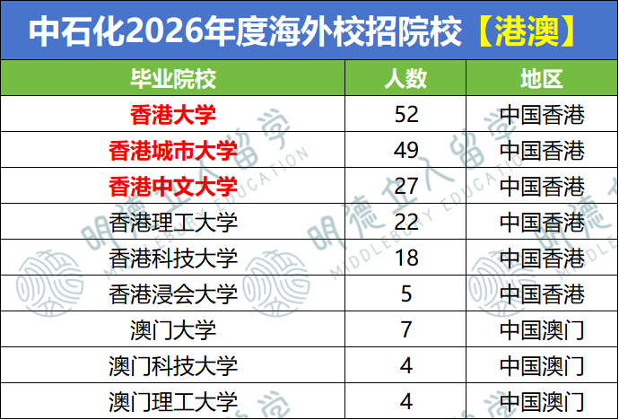 香港大学、香港城市大学、香港中文大学的毕业生是中国石化在港澳地区招聘的核心目标群体。