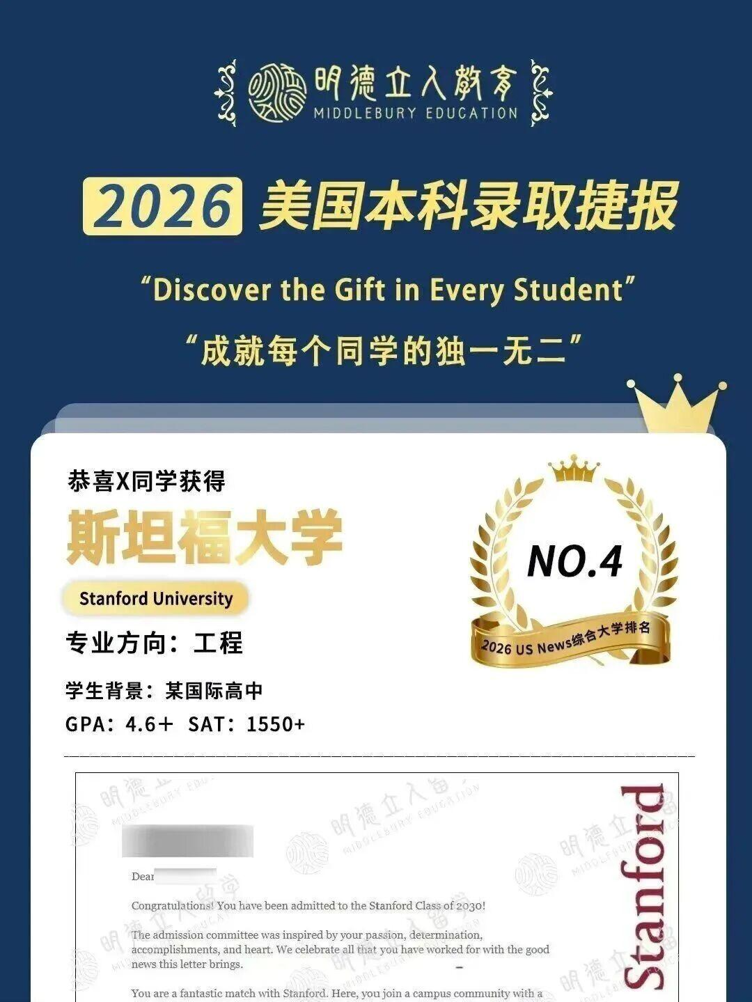 · 拿下理工硬骨头,明德学子X同学斩获斯坦福大学工程录取。