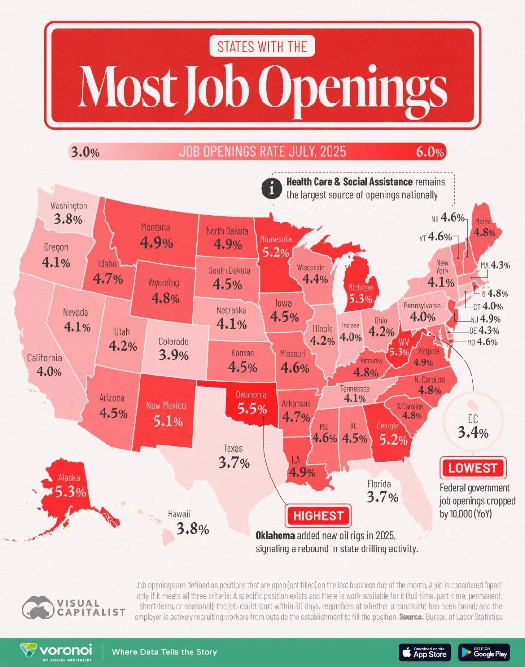 全美“zui容易就业”的州来了!美国5州岗位缺口均超20万,机会比加州还多?