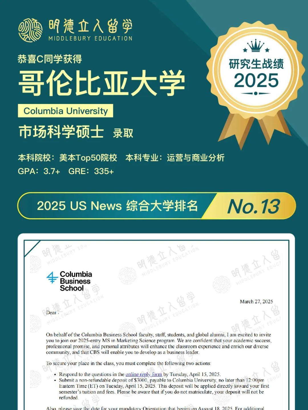 这样充分的准备,结果当然是学生顺利拿下了全美TOP1哥大市场科学,其他项目如UCB-运筹、杜克BA等也不在话下!