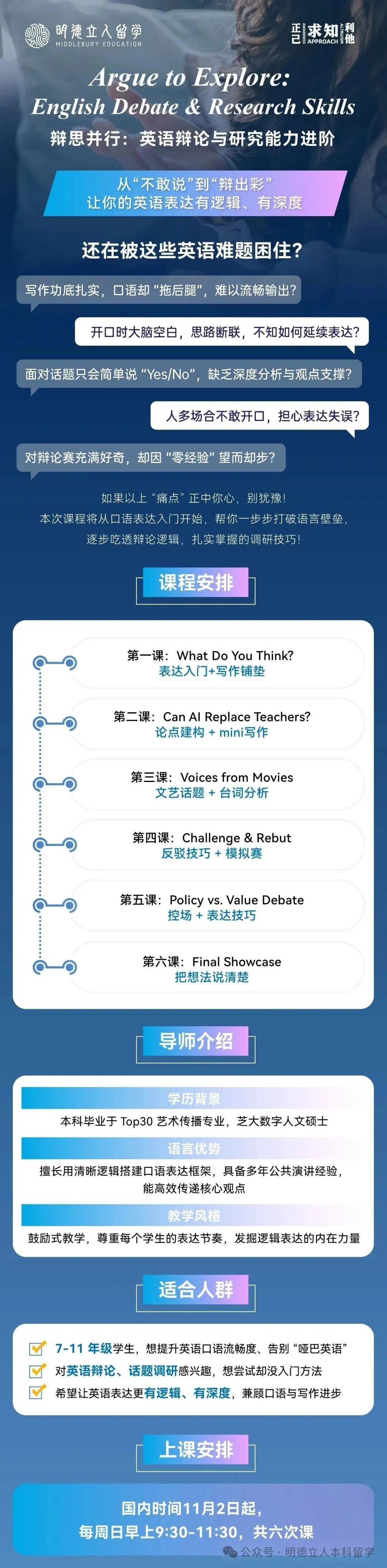 这门课程专为 7-11 年级学生打造,从口语表达入门到辩论逻辑吃透,从调研技巧掌握到控场能力提升,六节精品课程将带你从 “不敢说” 蜕变为 “辩出彩”。