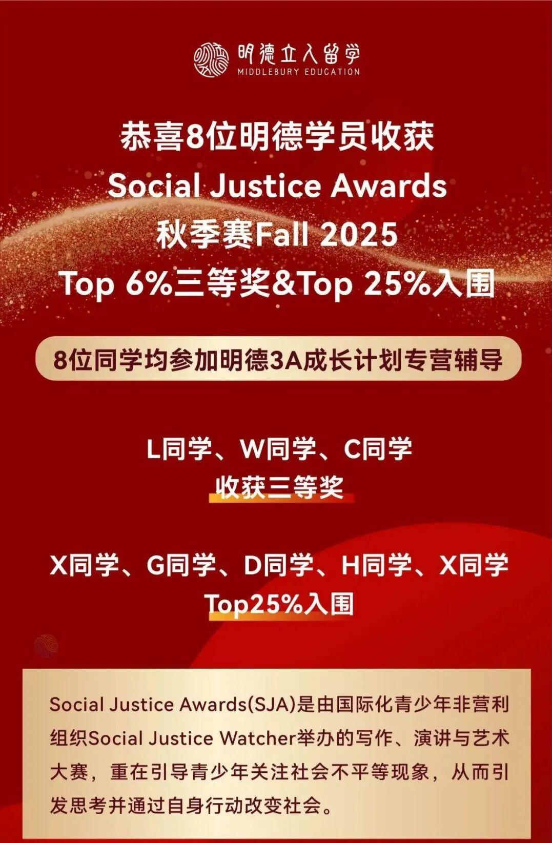8 位明德学员 在 Social Justice Awards(SJA)Fall 2025 秋季赛中脱颖而出,喜获佳绩,其中: