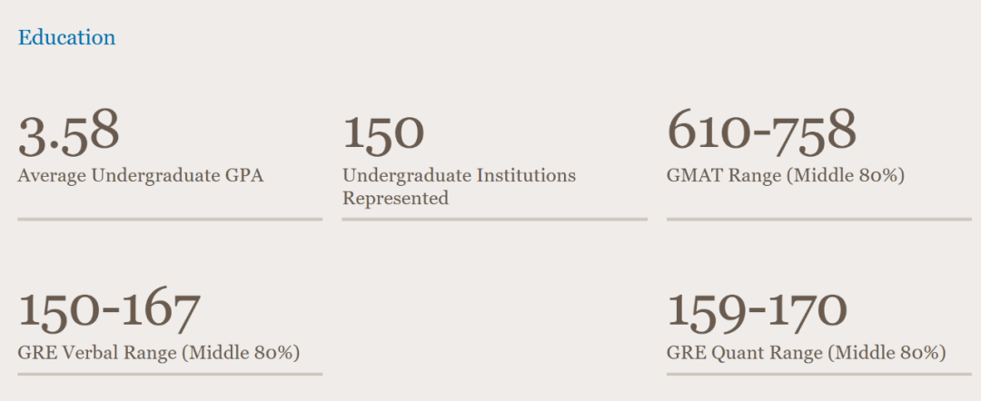录取者的平均年龄为23岁,平均GPA为3.58,GMAT范围为610-758(中间80%),GRE-V的范围为150-167、GRE-Q的范围为159-170。