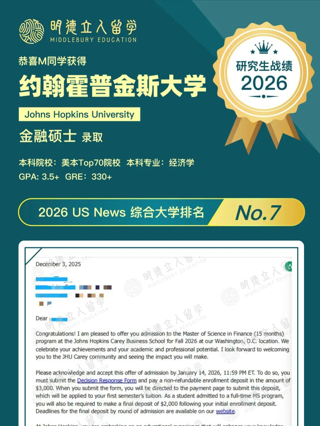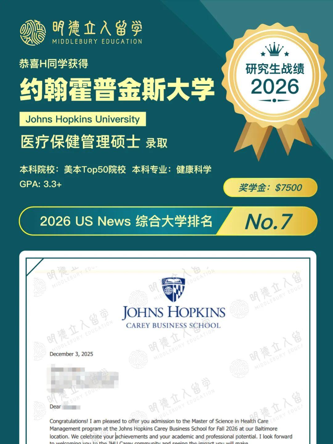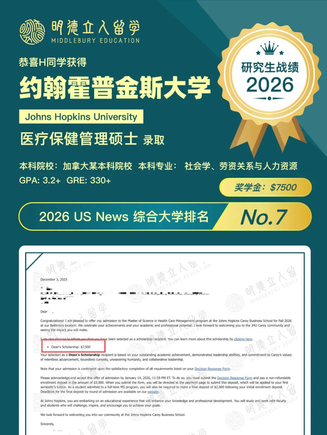 ✅不仅获得了JHU医疗保健管理硕士的录取offer,还获得了$7500奖学金,约合人民币5.3万!