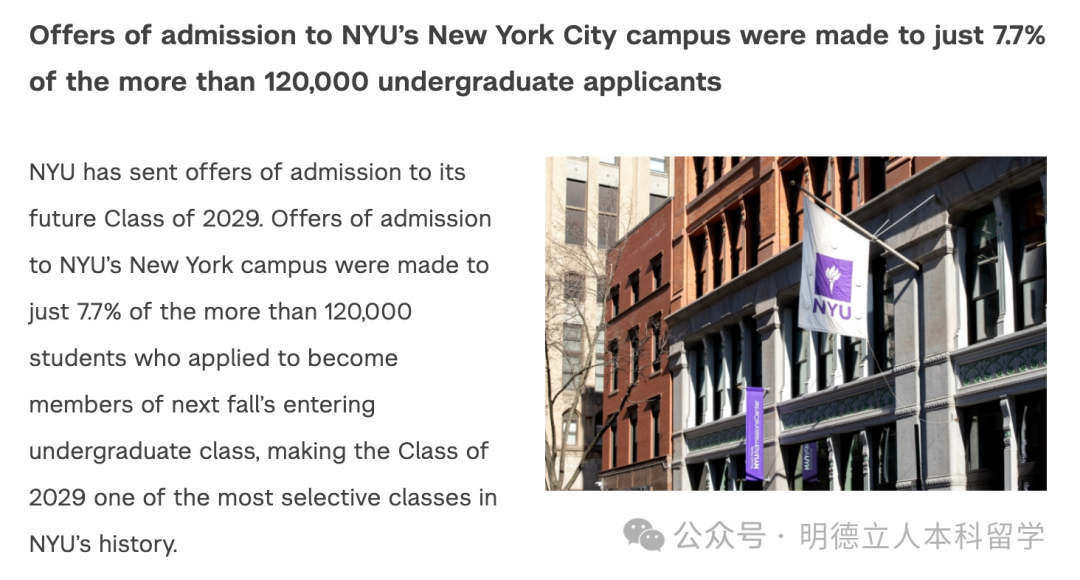 纽约大学(纽约校区)收到超过12万份申请,仅录取7.7%。