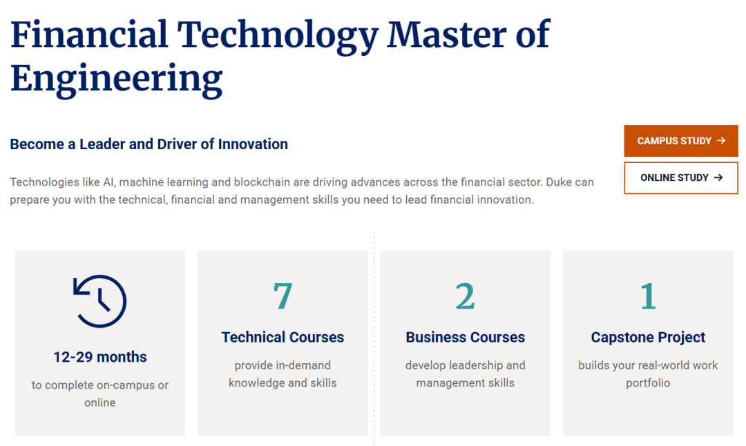 杜克大学的金融科技硕士(Financial Technology Master of Engineering,FinTech)项目,由杜克Pratt工程学院和杜克金融经济中心(DFE)联合开设。