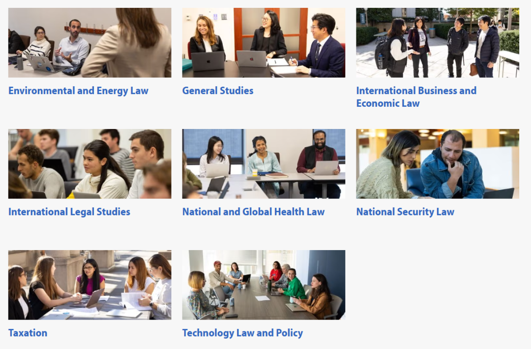 环境与能源法、国家和全球卫生法、国际商法与经济法、国家安全法、税法、科技法律与政策等8个方向。