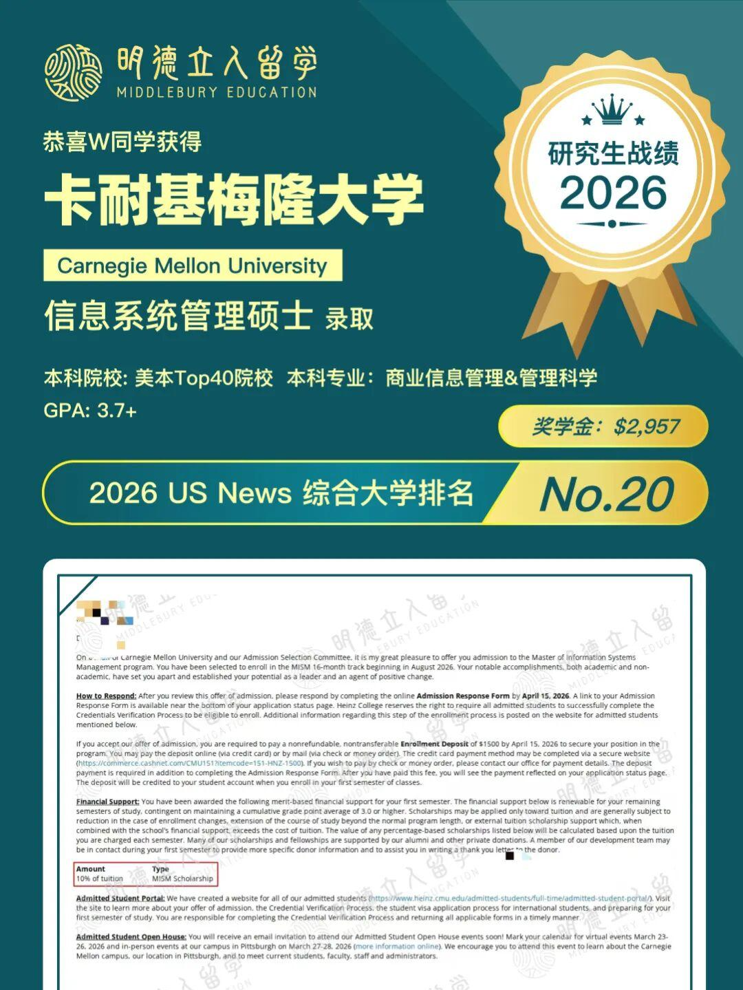 也正是因为这个项目和学生的背景十分匹配,我们在文书上精益求精,因此一般不轻易“发奖”的CMU给了我们奖学金(2,957美元,约人民币2万元)。