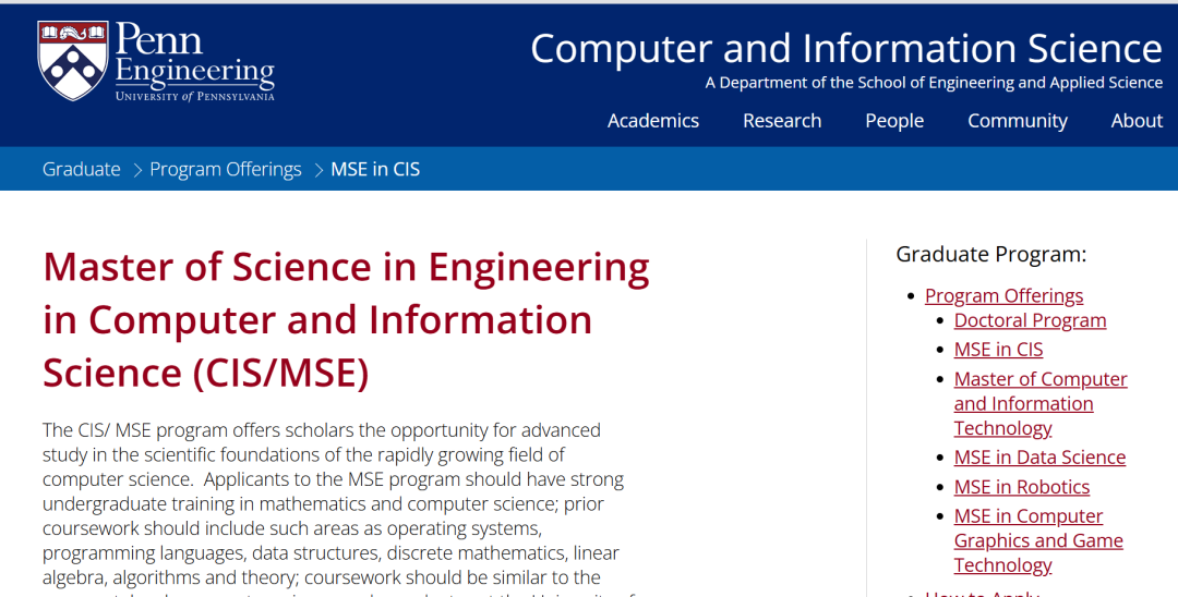 计算机与信息科学工程硕士(Master of Science in Engineering in Computer and Information Science,CIS/MSE)开设在宾大工程学院-计算机与信息科学系(CIS)之下。