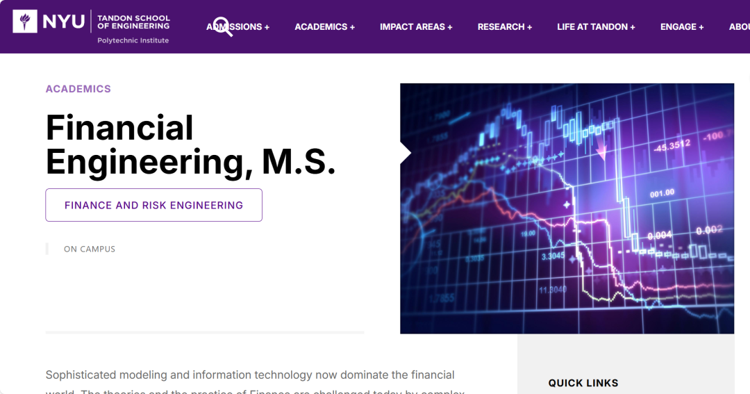 纽约大学的金融工程硕士(MFE)项目开设在NYU Tandon工学院下,该项目旨在培养学生将金融理论转化为实践的能力,专注于金融领域的复杂系统、全球市场动态以及不断变化的监管环境。