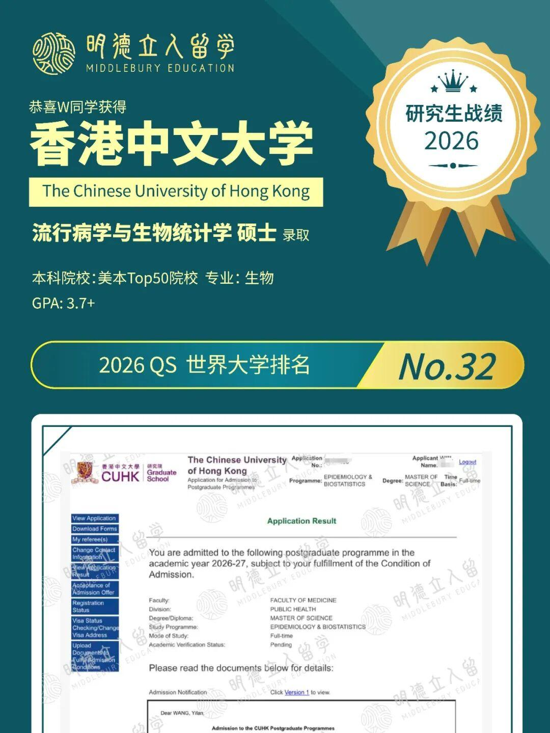 香港中文大学(CUHK)流行病学与生物统计硕士(MSc in Epidemiology and Biostatistics)是医学与公共卫生领域的顶尖项目,旨在培养具备量化研究能力和循证决策思维的复合型人才。