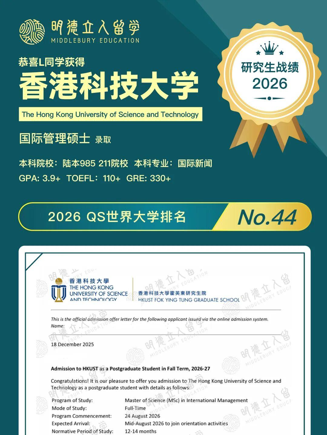 恭喜明德立人学子L同学,从陆本985/211院校出发,成功斩获——