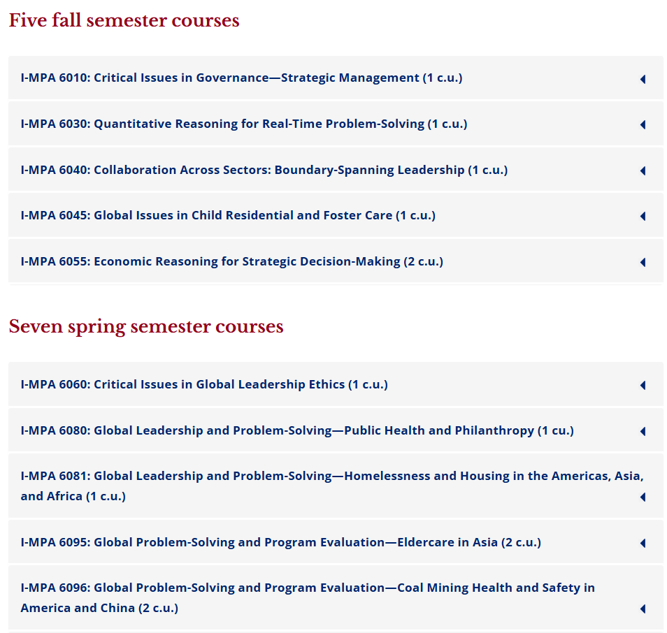 I-MPA项目学制为一学年,需修读十门课程方可完成学业。