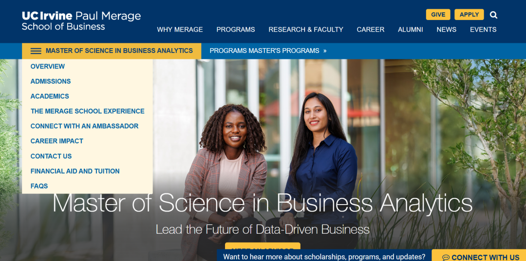 UC Irvine的商业分析硕士(Master of Science in Business Analytics)项目由保罗・梅拉奇商学院开设,是为期一年的全日制 STEM 认证项目。