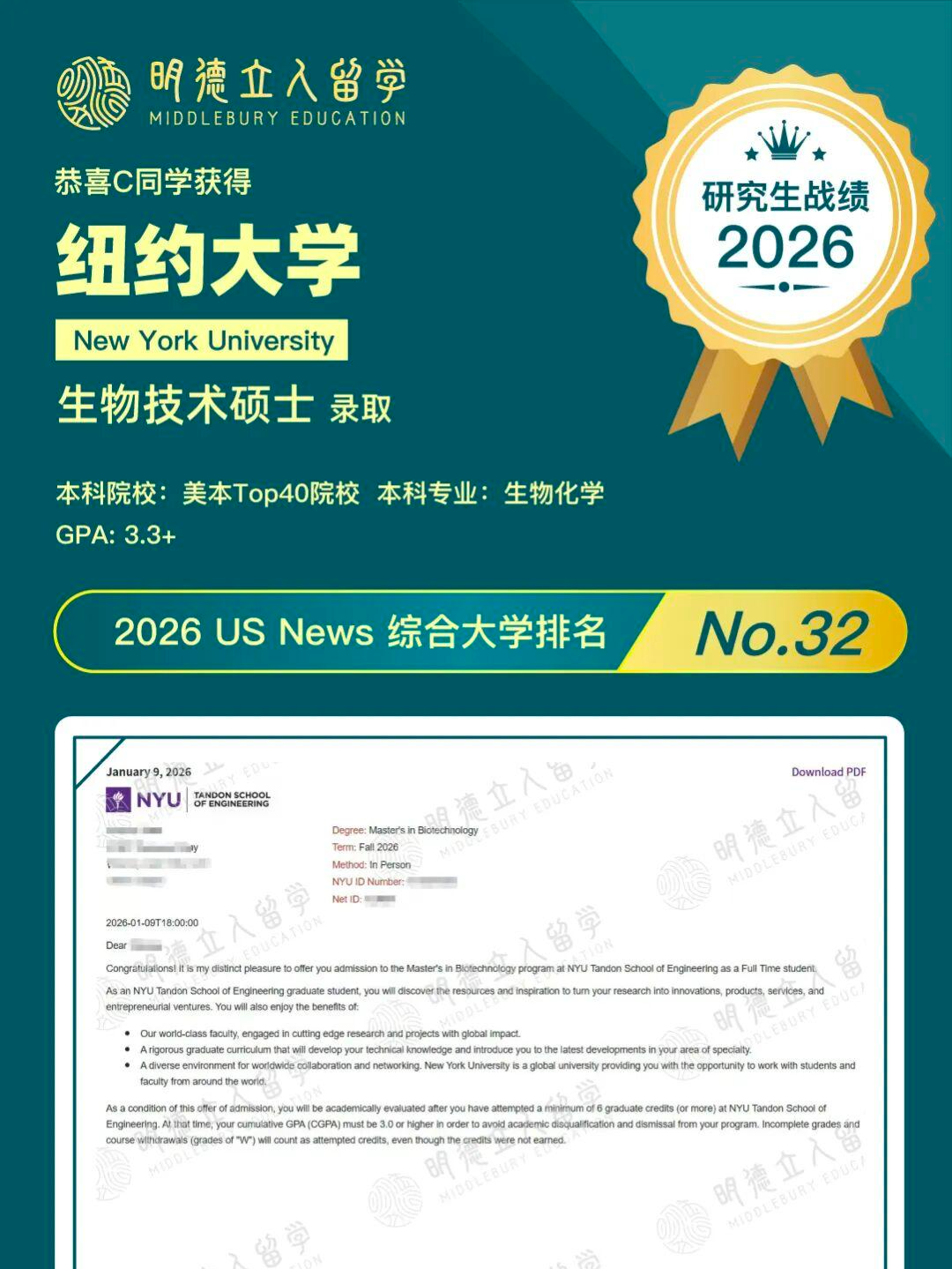 恭喜明德立人学子C同学!从GPA 3.3+出发,成功拿下——