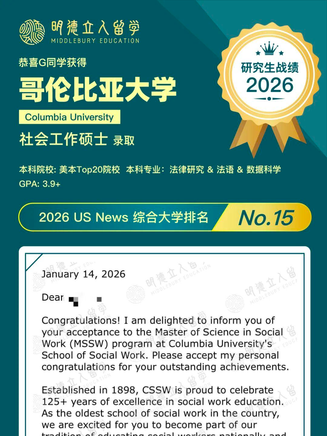 恭喜明德学子G同学!继宾大I-MPA录取后,迎来了第二枚offer!
