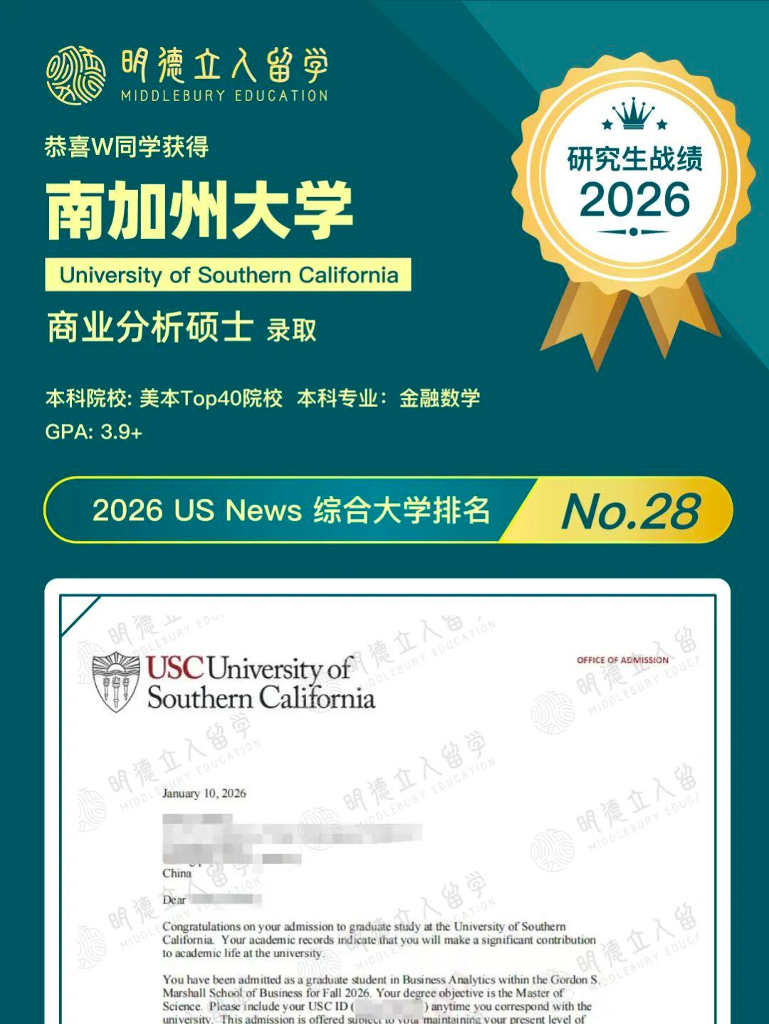 导师推荐的USC MSBA项目,商学院排名高、就业机会丰富,且免GRE政策与学生需求高度契合!在收到面试后,导师也及时提供了问题框架辅导,最后顺利下offer!