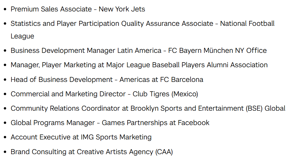 而体育商业硕士在领域有许多工作机会,NYU官网列出了往届毕业生获得的各类工作列表:
