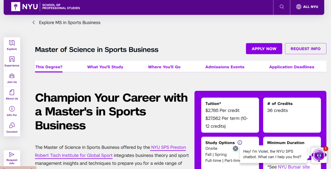 纽约大学体育商业理学硕士( MS in Sports Business)项目由纽大职业教育学院(NYU SPS)普雷斯顿・罗伯特・Tisch 全球体育研究所开设。