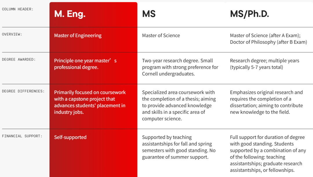而计算机科学理学(MS)硕士学位,是两年制研究学位,一个10-15人的小型项目,强烈偏好康奈尔本科生,为希望进入工业领域的开发或研究岗位、读博、教学岗位的同学准备。