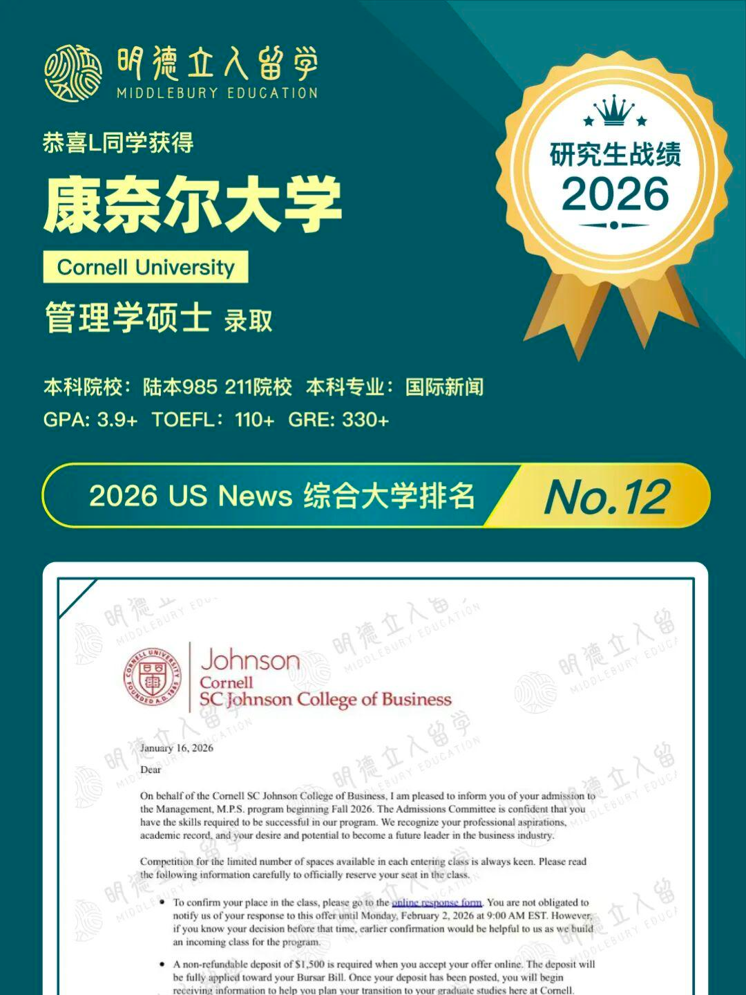 2026 U.S. News全美最佳综合大学排名中,康奈尔位列第12名!