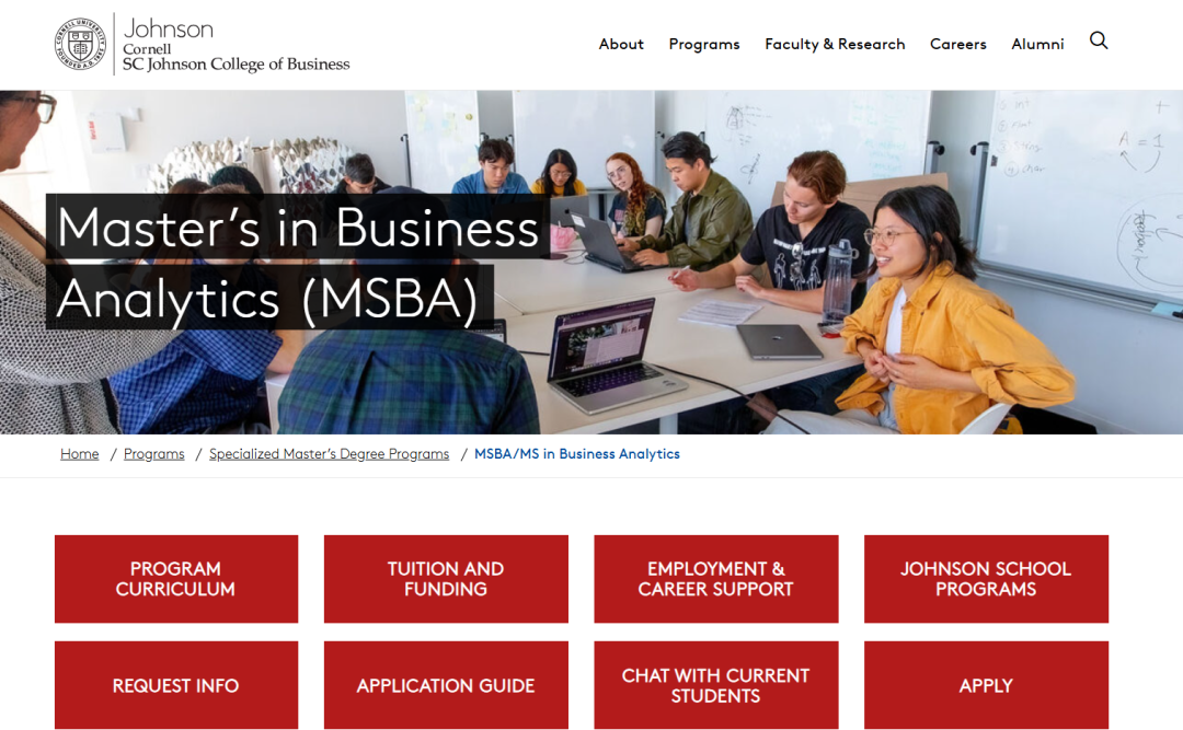 25年年底,康奈尔大学约翰逊商学院正式增设商业分析硕士(MSBA)项目(全日制就读模式),于2026年秋季首次招生,在康奈尔Teche(科技校区)就读。