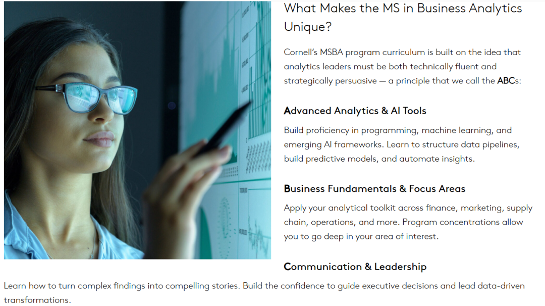 康奈尔大学MSBA项目遵循“ABC”培养原则:从编程、机器学习和人工智能,到商业重点领域,再到交流与沟通都有,课程全能!