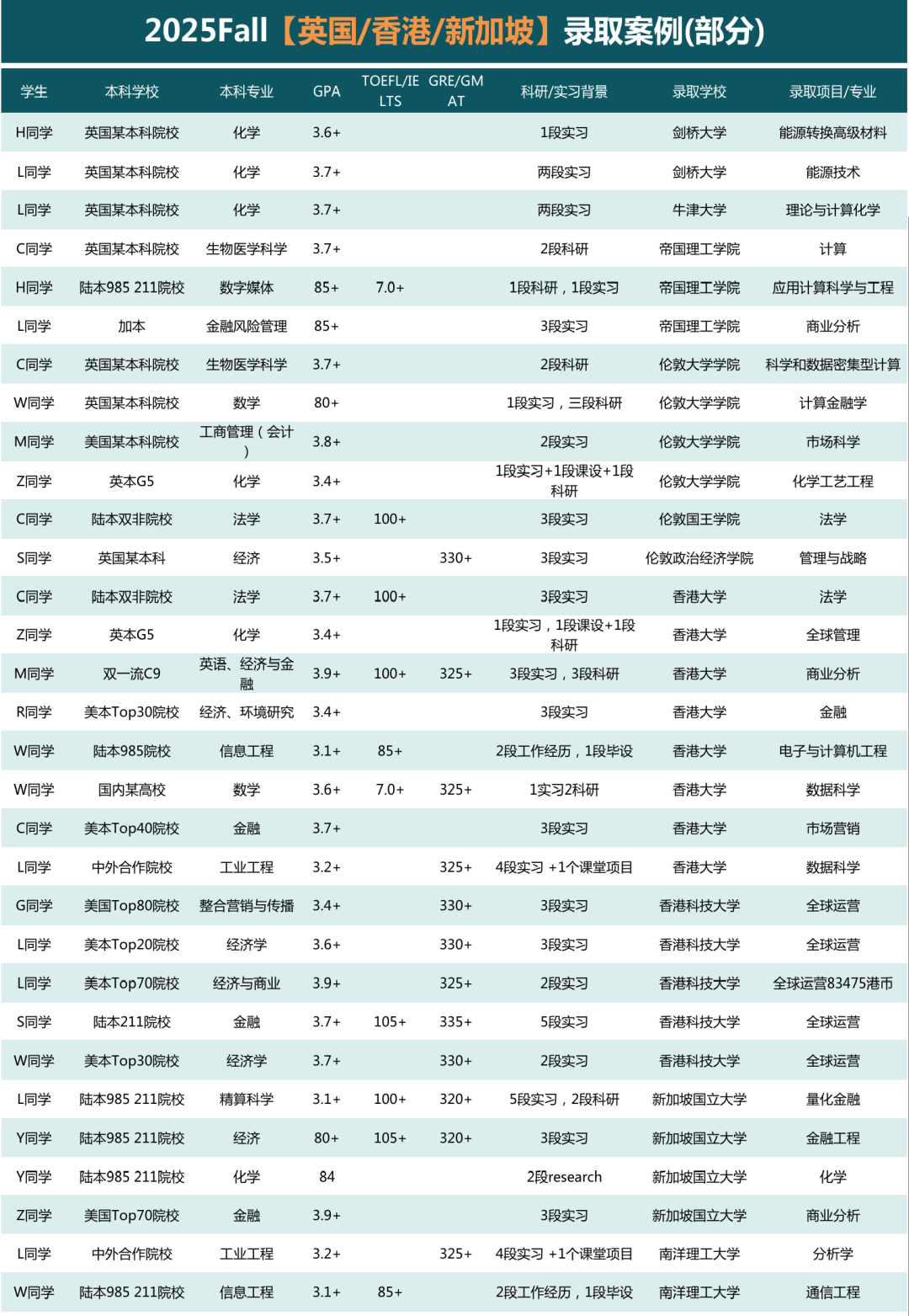 涵盖剑桥、牛津、帝国理工、UCL等QS排名世界前10的院校,还有LSE、KCL、港大、港科大、新国立、南洋理工等世界名校。