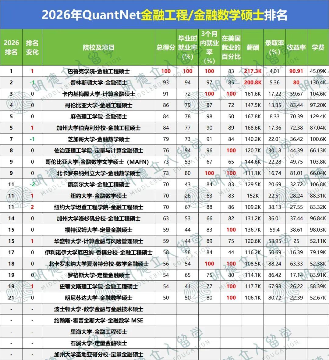 而MFE项目是美国最好的金工项目之一,在最新QuantNet 2026 MFE金融工程榜单中排名第11,以超凡的就业能力闻名。