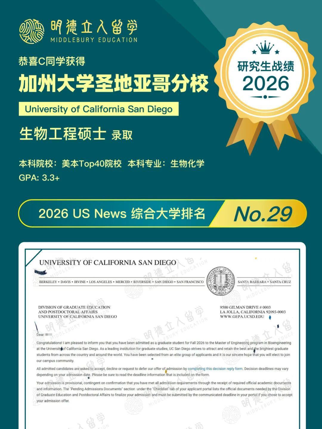 加州大学圣地亚哥分校(University of California, SanDiego,简称为UCSD),美国加州著名的公立大学,世界顶尖的研究型大学,环太平洋大学联盟、被誉为“公立常春藤”盟校。2026 U.S. News全美第29名!