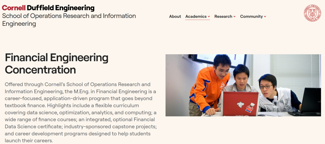 首先,地理位置的独特性:金工项目不仅依托于康奈尔大学底蕴深厚的伊萨卡主校区,还在纽约华尔街设立了CFEM(曼哈顿校区)。