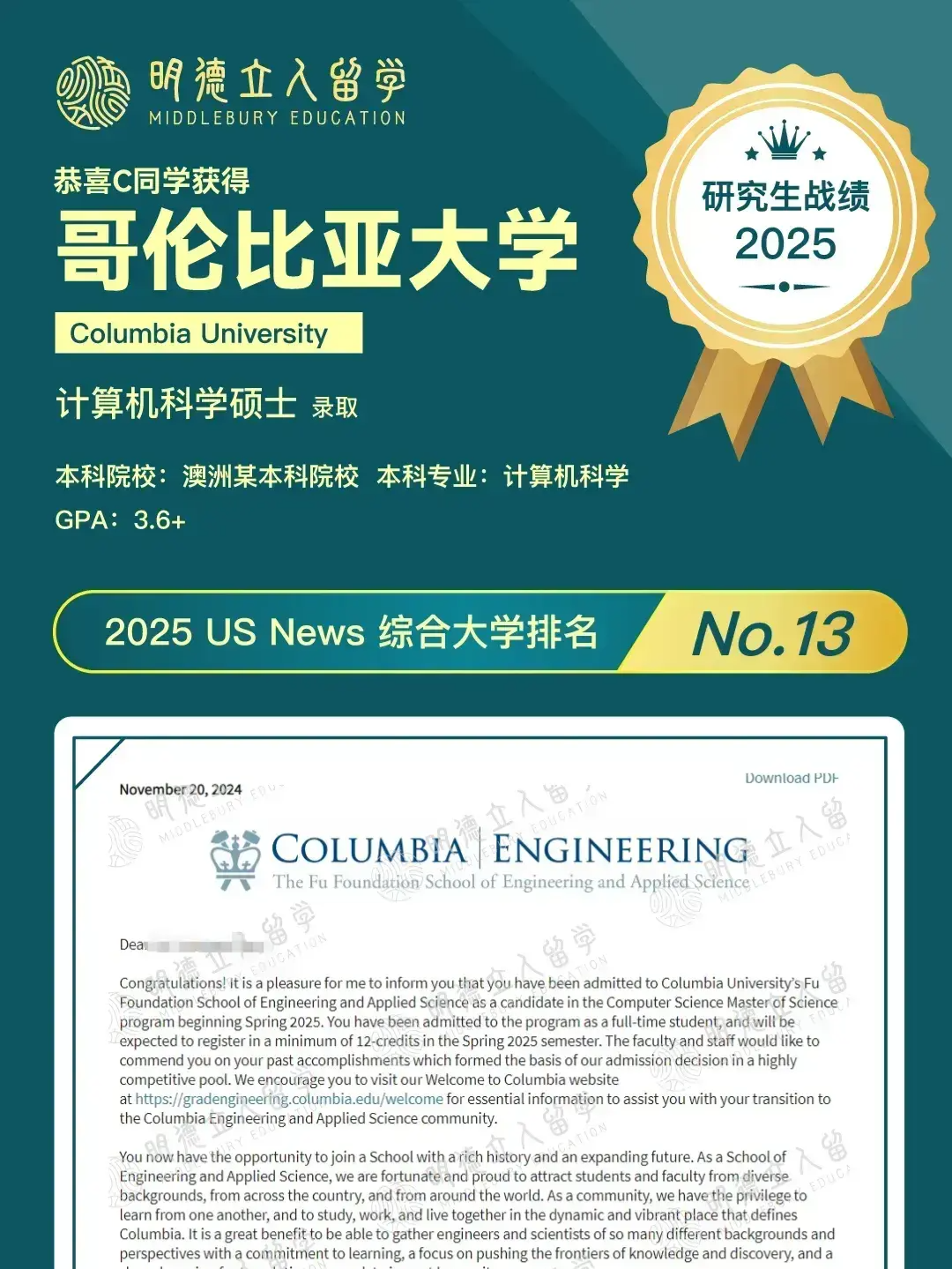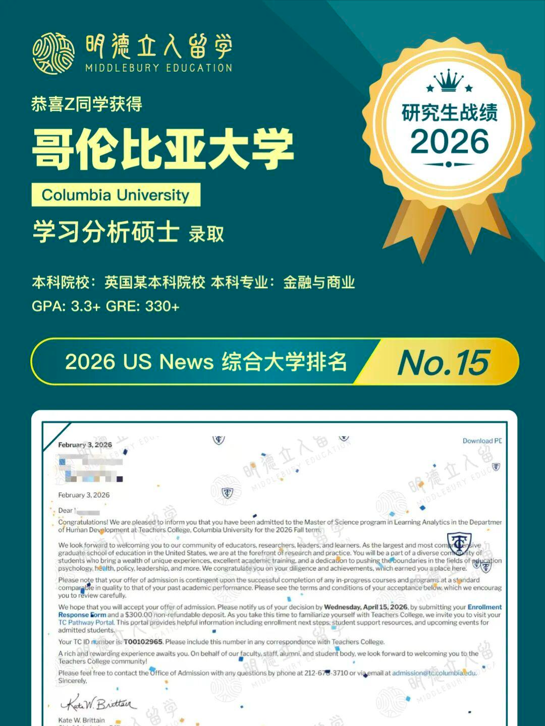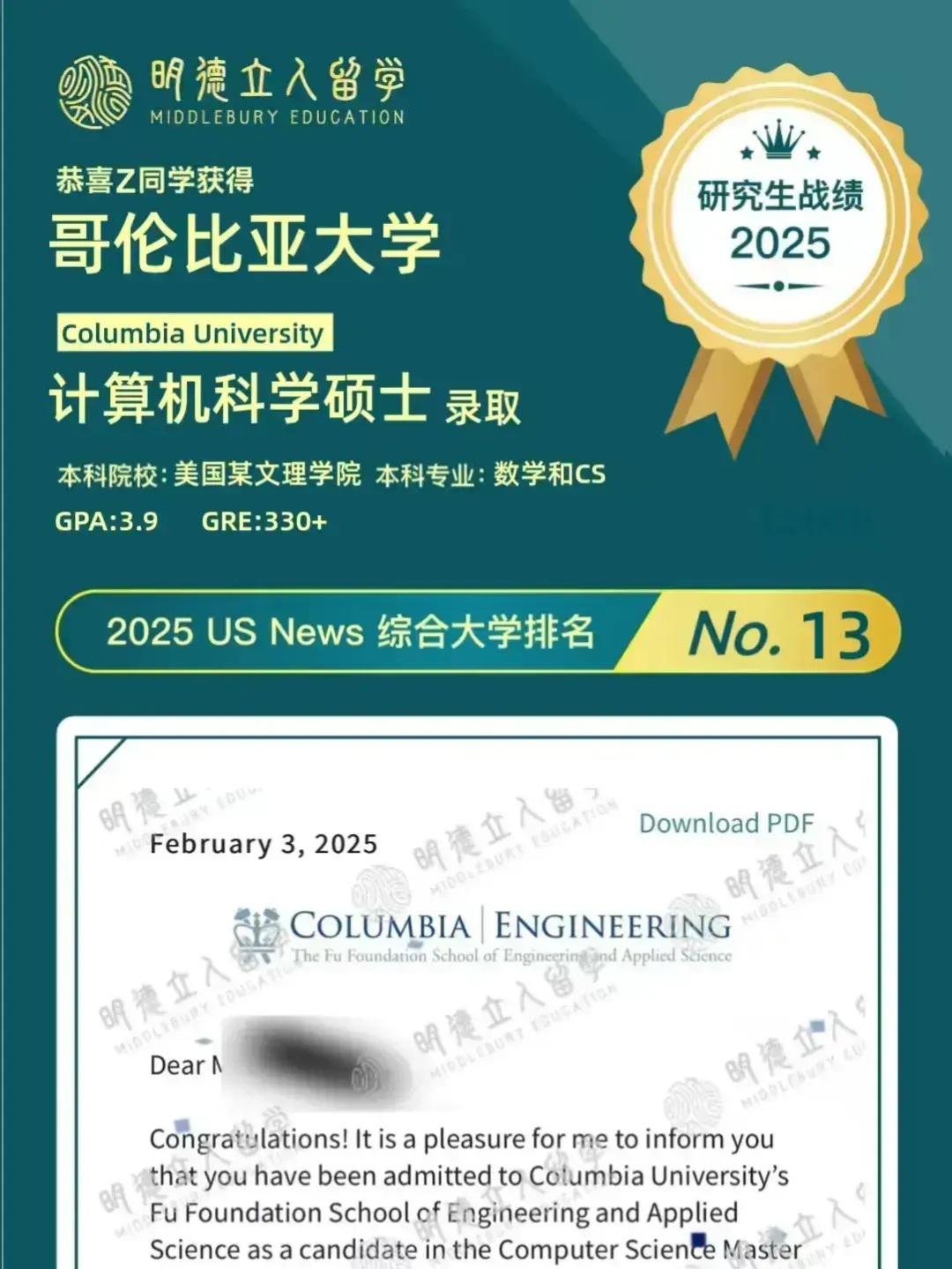 恭喜明德立人学子Z同学!从GPA3.3+出发,成功斩获——