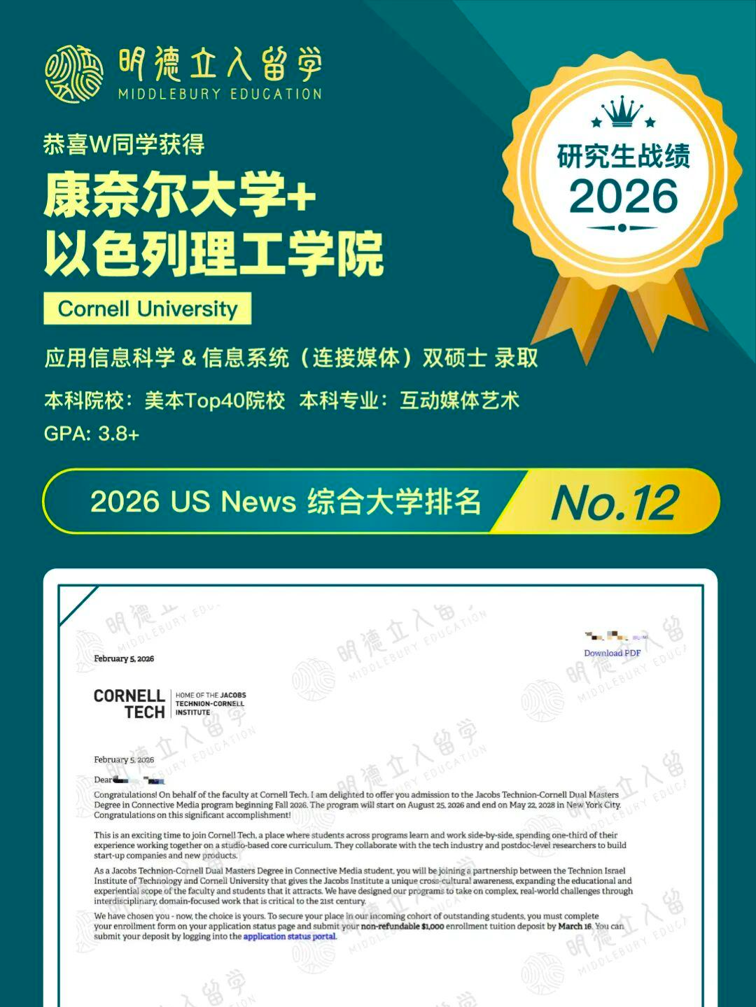 截至2026年2月6日,明德共计拿下 143枚美国研究生录取offer!
