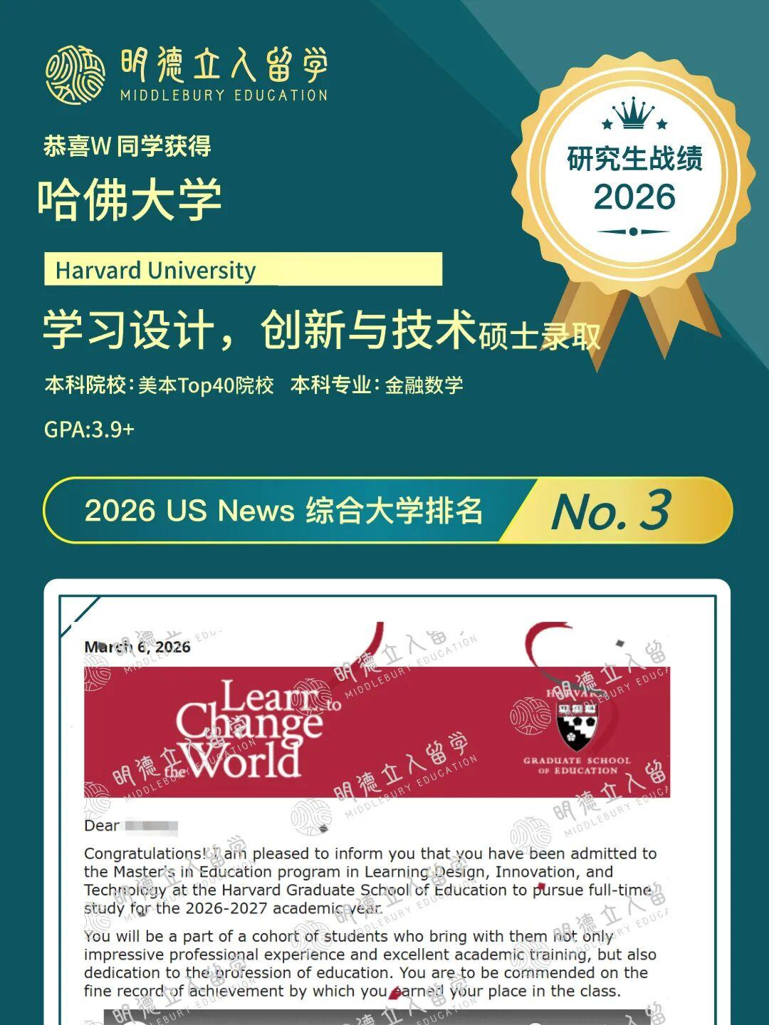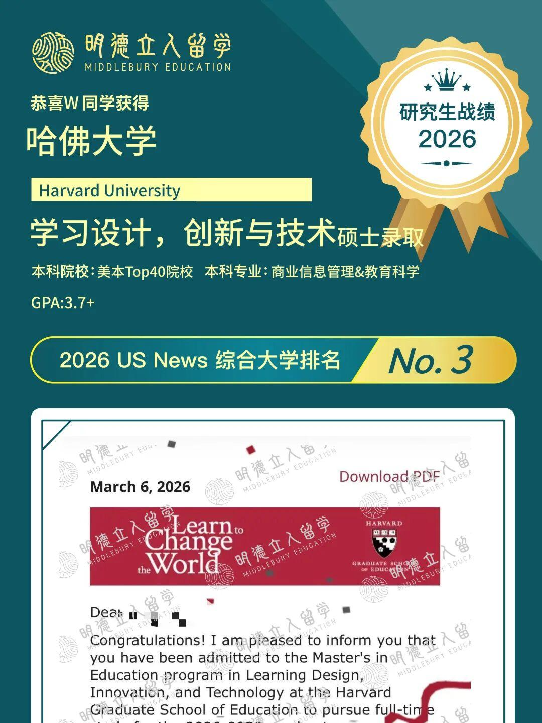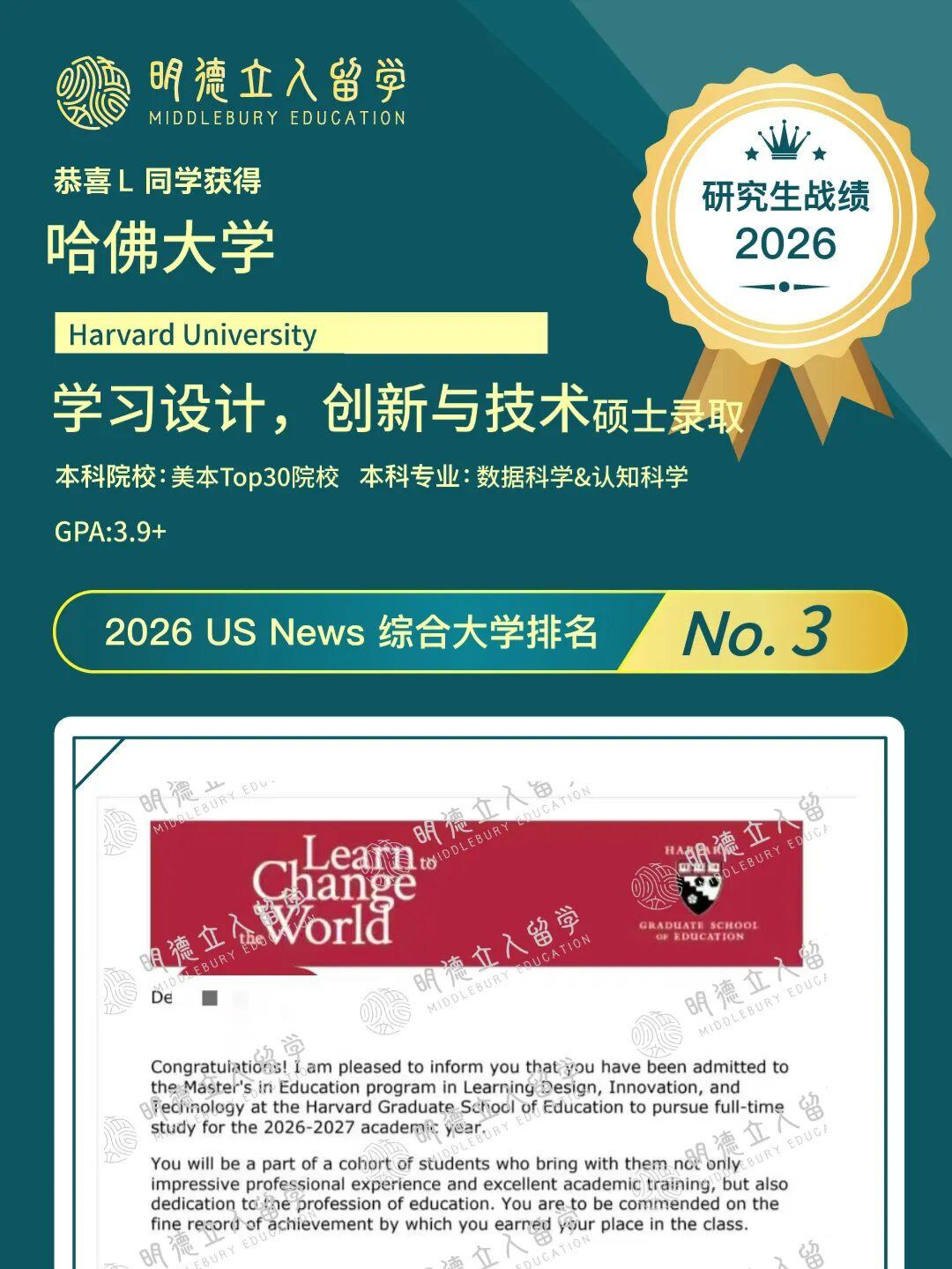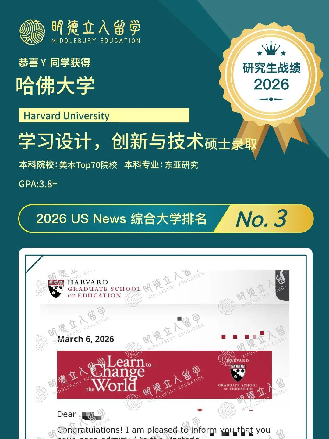 ✅明德学子Y同学,从美本Top70院校出发,成功斩获,哈佛大学-学习设计、创新与技术硕士offer!