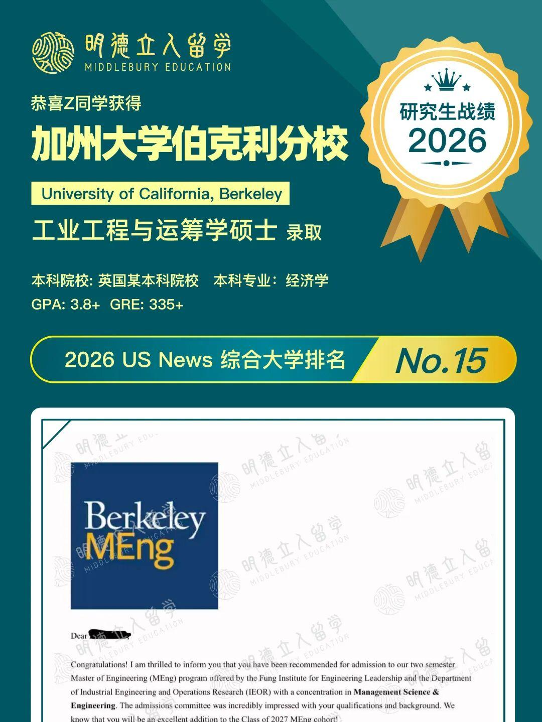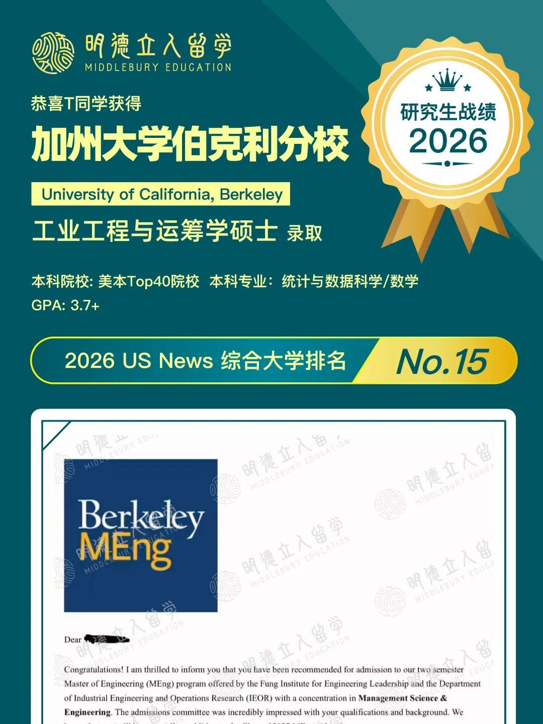 ✅️恭喜明德学子T同学,第8枚offer到!获得芝大、西北、康奈尔、康奈尔、JHU录取后,迎来UCB录取!