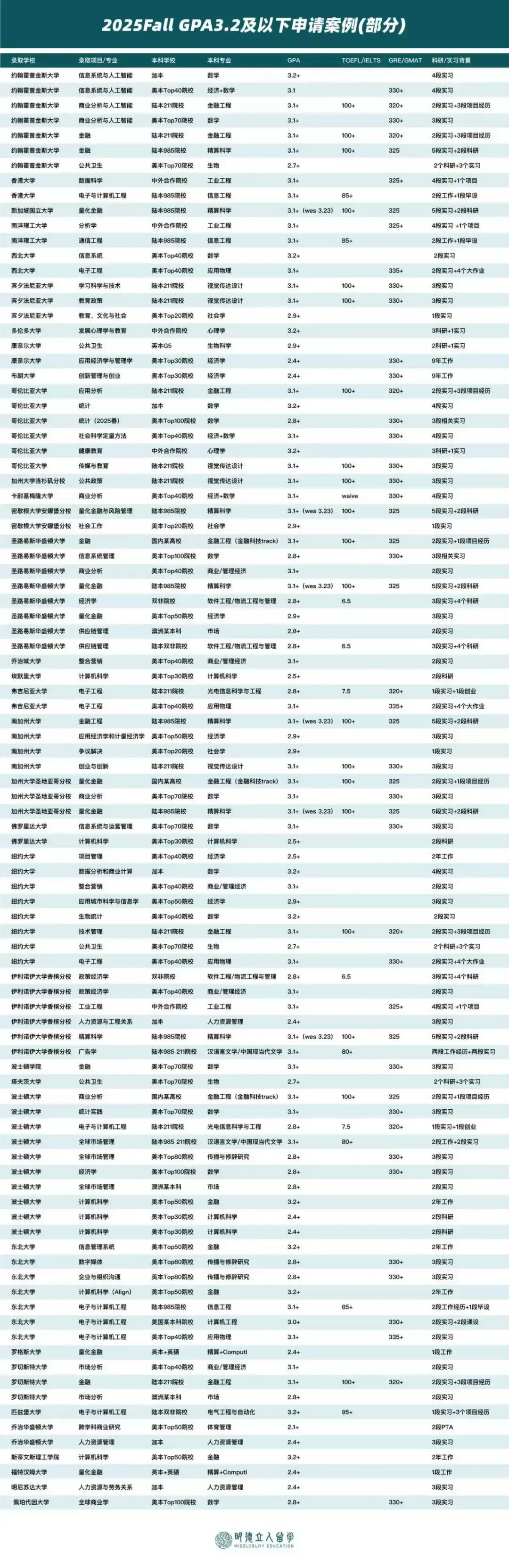 这里不得不提一下哥大,有藤校的title,没藤校的架子,25Fall年明德有6个低绩点的同学拿到了哥大录取,分别是应用分析、统计、社会科学定量方法、健康教育、传媒与教育专业,最低只有绩点2.8+!
