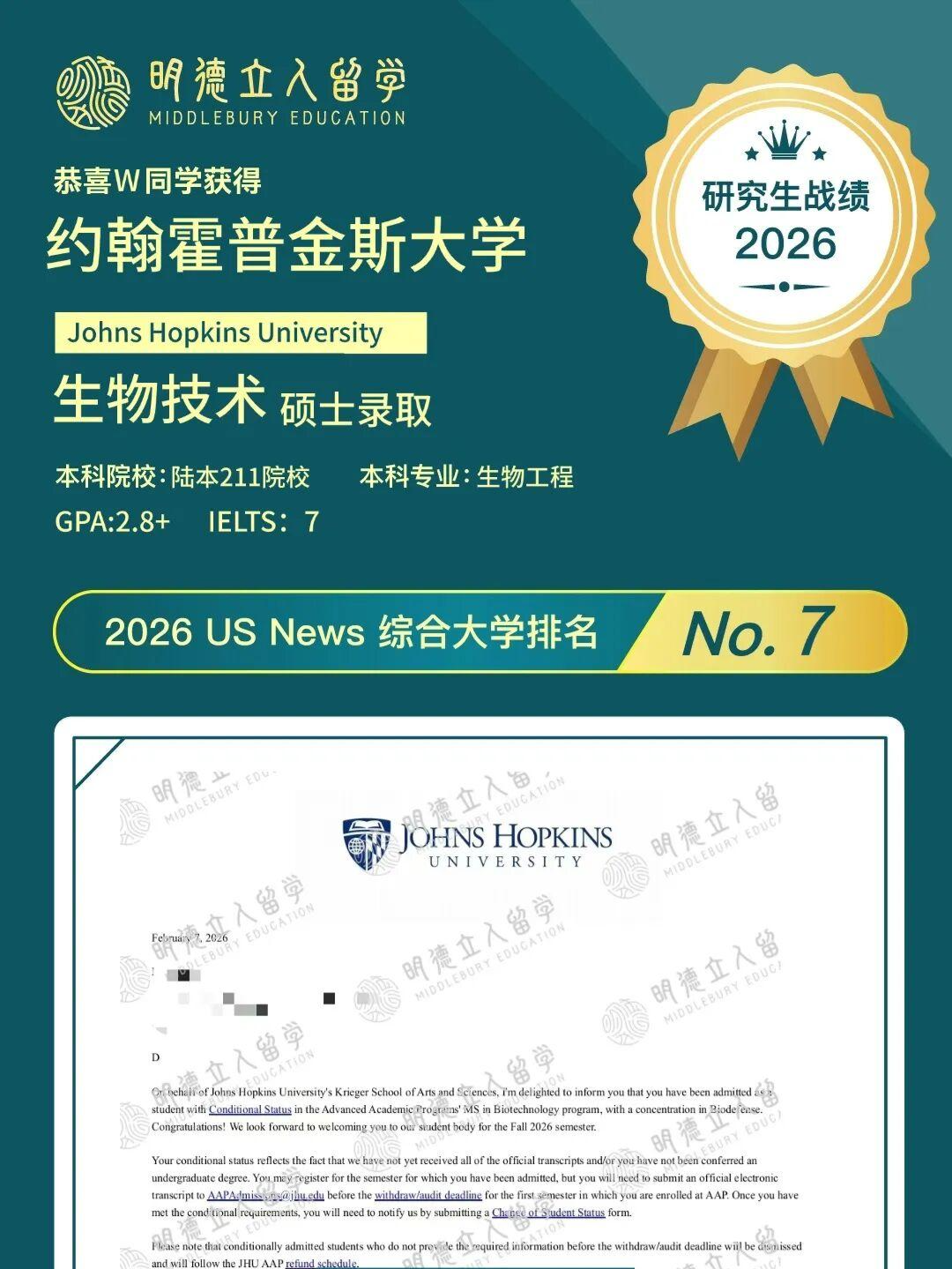 👉W同学:陆本、GPA2.8+,全美T7-JHU生物技术、东北大学-生物工程录取!