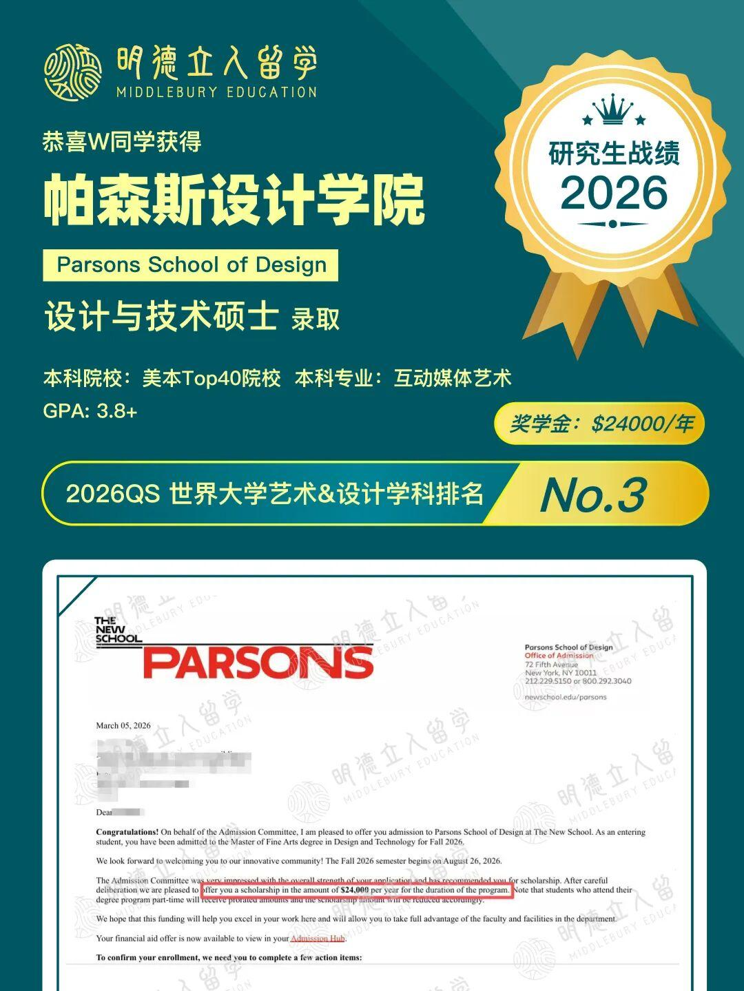 恭喜明德学子W同学,斩获全美第一设计学院——