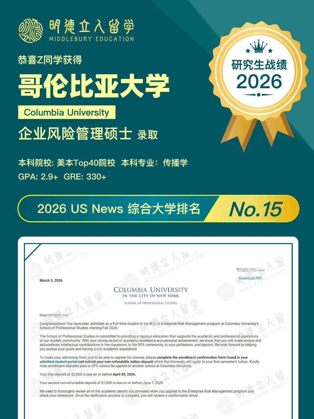 恭喜明德学子Z同学,GPA2.9+逆袭藤校!!成功拿下——