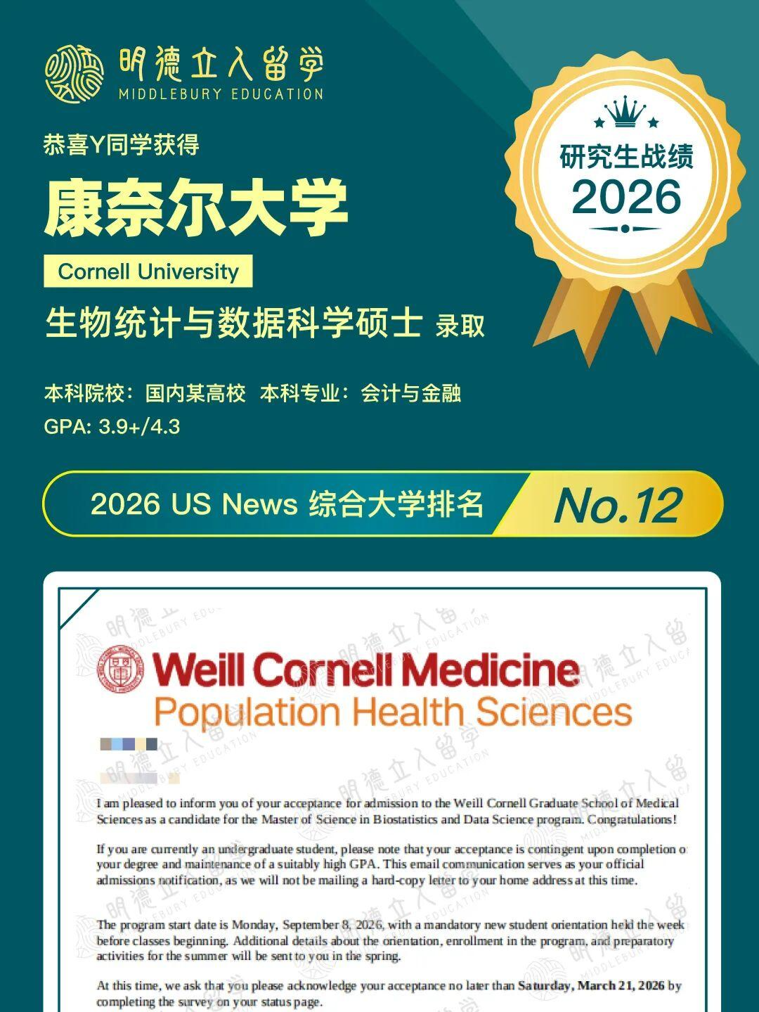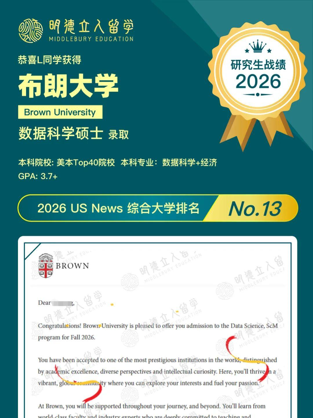 恭喜明德学子Y同学,斩获藤校——